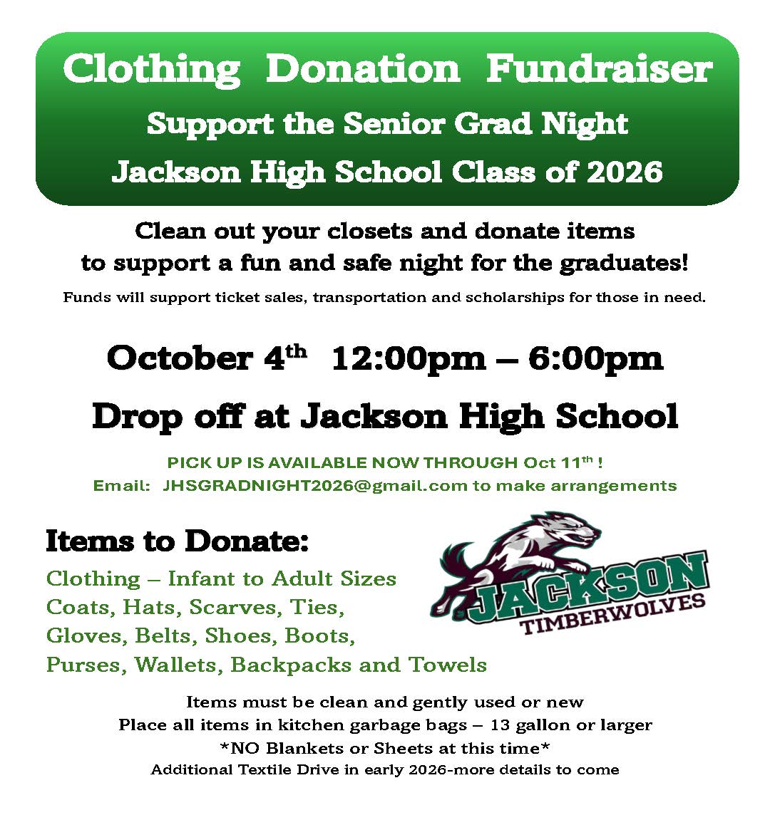- Jackson High School parking lot, October 4, 12 pm – 6 pm. See their flyer for details.