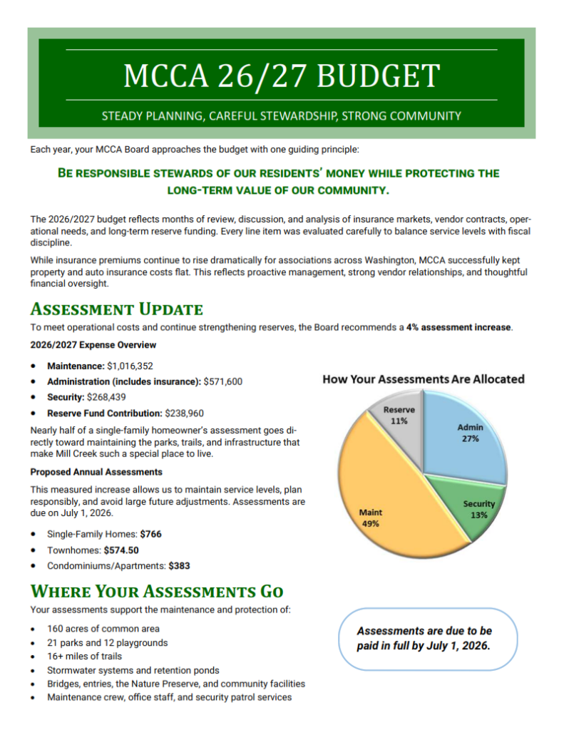 The 2026 Budget Ratification Meeting will be held online at 7 pm on Thursday, April 23. You can find the link to join on the MCCA calendar and in the 2026 Budget Newsletter. All ballots and votes must be received by 9 pm on Thursday, April 23.